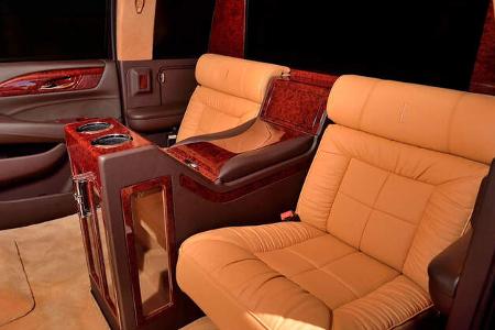 Die VIPs im Fond nehmen auf braunen, mit weichem Leder bezogen Sitzen Platz, die vielfältig elektrisch einstellbar und mit faltbaren Holztischen sowie Kühlschränken ausgerüstet sind.