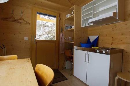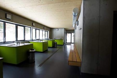 Der Campingplatz in Morteratsch hat neben verschneiten Sitzgelegenheiten draußen auch gemütliche Aufenthaltsräume, in denen man lesen oder WLAN nutzen kann oder eine kleine Gemeinschaftsküche benutzen kann.