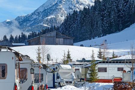 Wintercampingtraum auf dem Tirolcamp in Fieberbrunn: Vom Wohnwagen oder Mobil aus kann man direkt zur Piste nebenan stapfen. Oder die Kinder dahin begleiten und dann ein Sonnenbad nehmen?