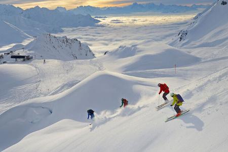Hochnebel hängt noch malerisch über dem Tal. Konzentration! Rund 200 Kilometer Gelände- abfahrten sorgen für Herzklopfen, zitternde Oberschenkel am Abend – und ganz großes Skifahrglück.