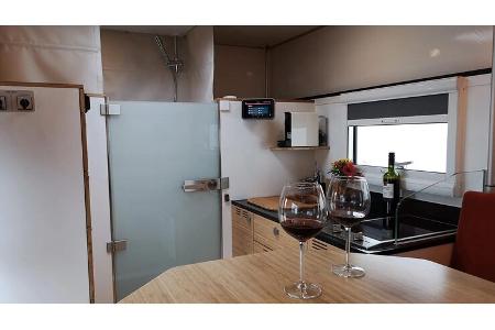 © Blissmobil So komfortabel und vollständig ist die Küche in der 13-Fuß-Kabine von Blissmobil ausgestattet: Vom Mikrowellenofen bis zum Weinglashalter.