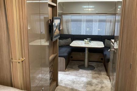 © L.Geiger Die Rundsitzgruppe im Heck des Tendenza 560 SG ist mit der neuen Stoffvarianten "Cannes" in dunkelblau ausgestattet.