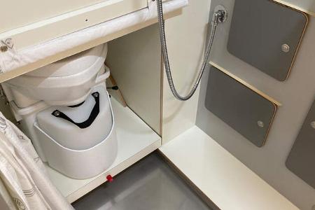 Platz in der Dusche schafft das verschiebbare Klo, welches einfach unters Bett geschoben wird.