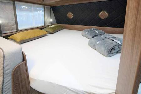 Die Eltern schlafen in einem Querbett im Bug des Caravans. Wegen der Aufbautür und der rechts davon montierten Garderobe, wird die Liegefläche am Fußende etwas schmaler.