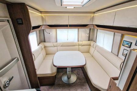Gemessen an der Wagenlänge feudale Rundsitzgruppe mit verlängerter linker Sitzbank. Die Kunstlederpolster gibt es optional.