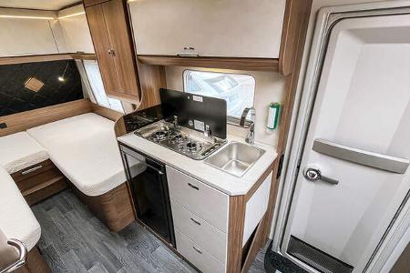 Tabbert Cazadora 460 E: Die Kleiderschränke hängen über den Fußenden der Betten, der Kühlschrank steht im Küchenkorpus.