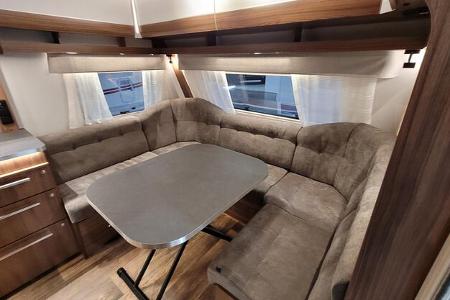 Betritt man den Wohnwagen, fällt ihm Bug direkt die große Rundsitzgruppe ins Auge.