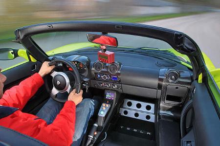 Dass der frisch vorgestellte Roadster noch ein Stück von der Serienfertigung entfernt ist, zeigt ein Blick ins Cockpit: So ein Lenkrad kriegt man Stand heute durch keine Zulassungsbehörde.