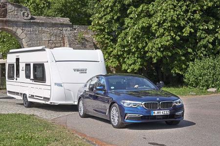 Der Rest der Limousine steht dem in nichts nach: Die Bordsysteme informieren über die Bereitschaft der Anhängerstabilisierung, blenden Verkehrshinweise und Tempolimits ein und helfen mit gestochen scharfem Kamerabild inklusive Kugelkopf-Zoom (Parking Assistant Plus, 510 Euro) beim Ankuppeln. Nur einen Rangierassistenten hat der 5er nicht, dafür rollt er ferngesteuert fahrerlos geradeaus in und aus Parklücken oder in die Nähe der Deichsel (790 Euro).