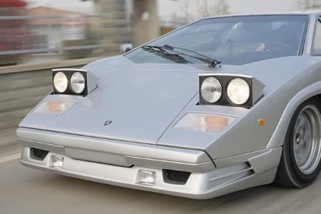 Die großen Klappscheinwerfer beherbergen jeweils zwei Rundscheinwerfer. Sie lassen die Front des Countach zwar etwas plump aussehen, ändern aber nichts an der furchteinflößenden Optik im Rückspiegel der Vorausfahrenden.