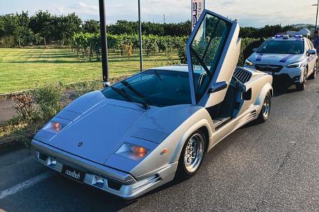Kurz vor Abschluss der Fahrt im Countach erfragen die netten Beamten der italienischen Polizei die Papiere von Fahrzeug und Fahrer. Sie teilen die Leidenschaft zum über 30-Jahre-alten Sportwagen-Legende.