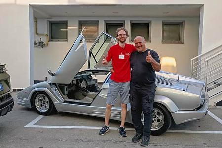 Glückliche Gesichter zum Ende eines glorreichen Tages. Sprachbarrieren rücken in den Hintergrund — der Countach dient als Dolmetscher.