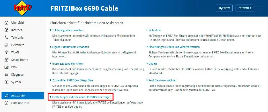 In der Regel führst Du einen Reset über die Einstellungen des Routers durch. Dafür meldest Du Dich über den Browser mit den Zugangsdaten am Router an. Bei der FRITZ!Box gibt es im Menü einen Punkt, der sich Umzugsassistent nennt. Dieser Assistent ist hilfreich, wenn Du auf ein neues Modell der FRITZ!Box wechselst. Du kannst mit der Funktion „Einstellungen auf eine neue FRITZ!Box übertragen“ die Konfiguration Deines Netzwerks übernehmen und auf das neue Gerät übertragen. Auch Fritz-Apps, VPN-Einstellungen und die Zugangsdaten für das Myfritz-Konto ziehen so um. Abschließend führt die FRITZ!Box auch einen Reset dieser Einstellungen vor, sodass der Router bereit für die Übergabe an einen neuen Besitzer ist.