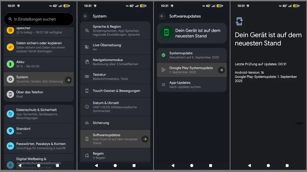 Du kannst auf Deinem Gerät mit wenigen Schritten prüfen, ob alle aktuellen Sicherheits-Updates installiert sind oder ob Aktualisierungen über Google Play verfügbar sind. Jedoch gilt auch hier, dass Google nicht unbegrenzt Aktualisierungen auf diesem Weg ausliefert. Stand Oktober 2025 erscheinen monatliche Sicherheits-Updates für die Android-Versionen 13 bis 16.