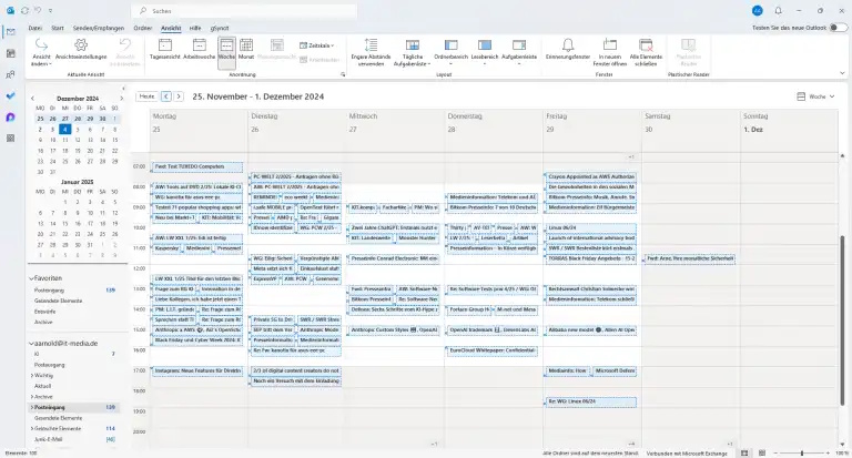 Bei der Flut an eingehenden E-Mails kann die Übersicht schon einmal verloren gehen. Wie siehst Du, wann welche Nachricht eingegangen ist und an welchen Tagen Dich besonders viele Mails erreichten? Wer das wissen möchte, ohne Zeit damit zu verlieren, in jeder einzelnen Mail nachzuschauen, sollte die Kalenderansicht von Outlook verwenden. Hier stellt die Kommunikationssoftware eingegangene E-Mails genau wie sonstige Kalendereinträge dar. Besonders praktisch: Für einen optimalen Überblick kannst Du auch hier zwischen einer Monats-, Wochen- oder Tagesansicht wechseln.