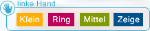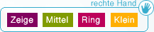 Welcher Finger für welche Tasten zuständig ist, können Sie jederzeit– also auch während des Trainierens – anhand der farblichen Zuordnung der Fingerbuttons "Klein – Ring – Mittel – Zeige" und der entsprechend farbigen Tasten der Tastatur erkennen.
