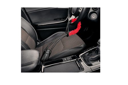 Einfach um das Lenkrad schlingen, in den Sicherheitsgurt-Sockel einstecken und abschließen