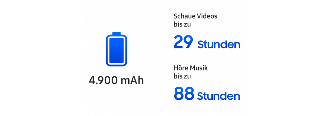 * Basierend auf internen Labortestbedingungen von Samsung mit einer Vorabversion des angegebenen Modells, die über Bluetooth unter Standardeinstellungen über LTE mit Kopfhörern verbunden ist. Geschätzt anhand der Akkukapazität und des gemessenen Stromverbrauchs gegenüber dem Akkuverbrauch bei Videowiedergabe (Videodateiauflösung 720p, auf dem Gerät gespeichert) und Audiowiedergabe (mp3-Datei, 192 kbit/s, auf dem Gerät gespeichert, LC-Display ausgeschaltet). Die tatsächlichen Video- und Audiowiedergabezeiten variieren je nach Netzwerkverbindung, Einstellungen, Dateiformat, Bildschirmhelligkeit, Batteriezustand und vielen anderen Faktoren.