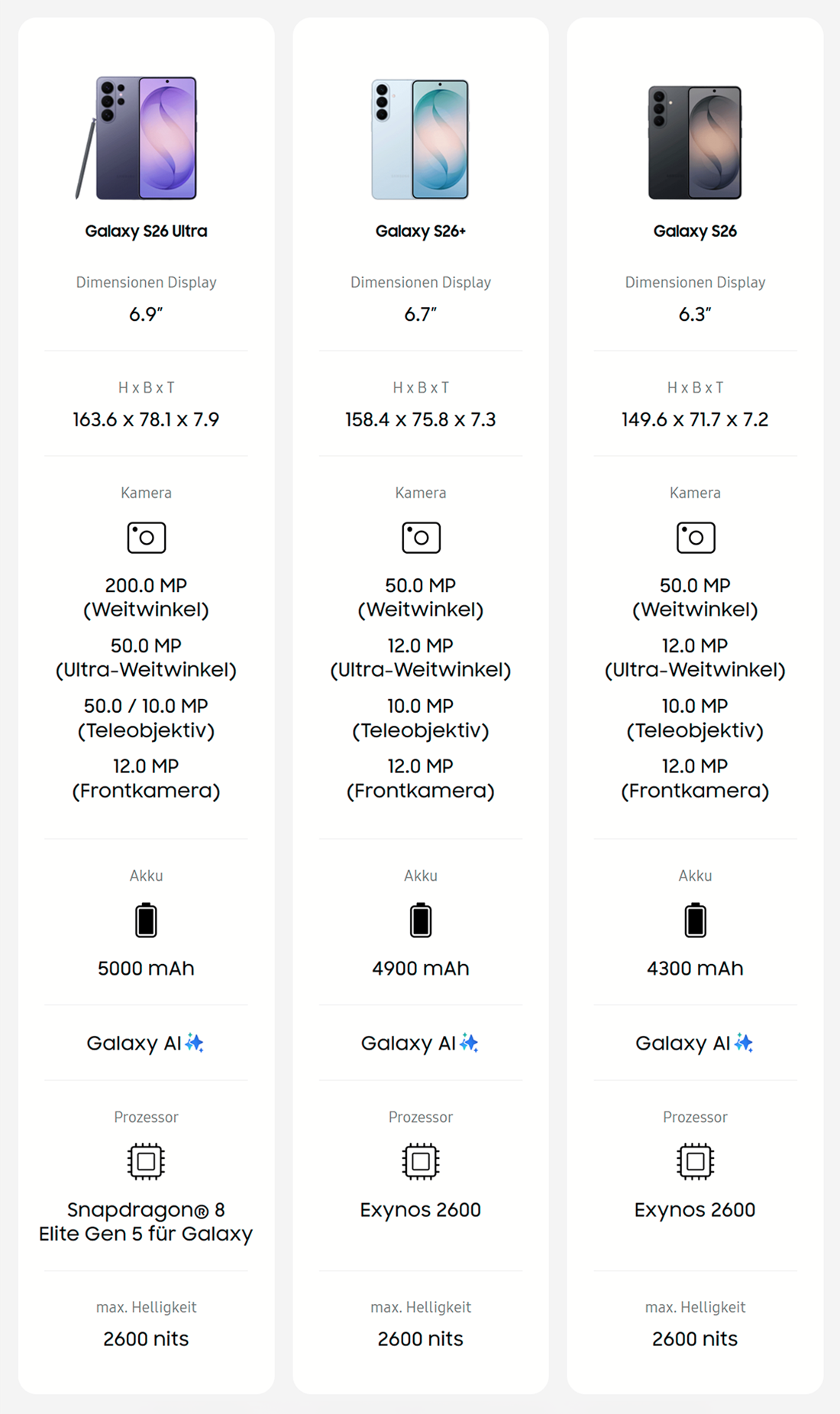 ** Dieses Angebot gilt ausschließlich für private Endkunden ab 18 Jahren bei Kauf eines Samsung Galaxy S26 / S26+ / S26 Ultra, auch in Kombination mit Abschluss eines freenet / klarmobil Mobilfunkvertrags. Bei verbindlicher Bestellung eines Samsung Galaxy S26 / S26+ / S26 Ultra mit 256 GB zwischen dem 25.02. - 10.03.2026 erhalten Kunden im Bestellprozess die Möglichkeit, das von ihnen gewählte Aktionsgerät mit der jeweils nächstgrößeren Speichervariante ohne Aufpreis bei freenet / klarmobil verbindlich zu bestellen. Beim S26 / S26+ / S26 Ultra ergibt sich hierdurch eine Ersparnis von 200 €. Der Kunde ist selbst dafür verantwortlich, ein Aktionsgerät mit der von ihm gewünschten Speichervariante auszuwählen. Hat sich der Kunde bereits für die höchste Speichervariante von 512 GB beim S26 / S26+ / S26 Ultra entschieden, so erhält er das von ihm gewählte Aktionsgerät zum Preis des Aktionsgerätes mit der nächstkleineren Speichervariante von 256 GB. Weitere Aktionsbedingungen unter: samsung.de/galaxy-s26-vorbestellen