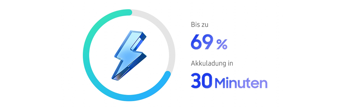 Bleibe im Flow: Dank schnellem Laden per Kabel bist du in etwa 30 Minuten wieder bei bis zu 69 % und kannst wie gewohnt weitermachen.