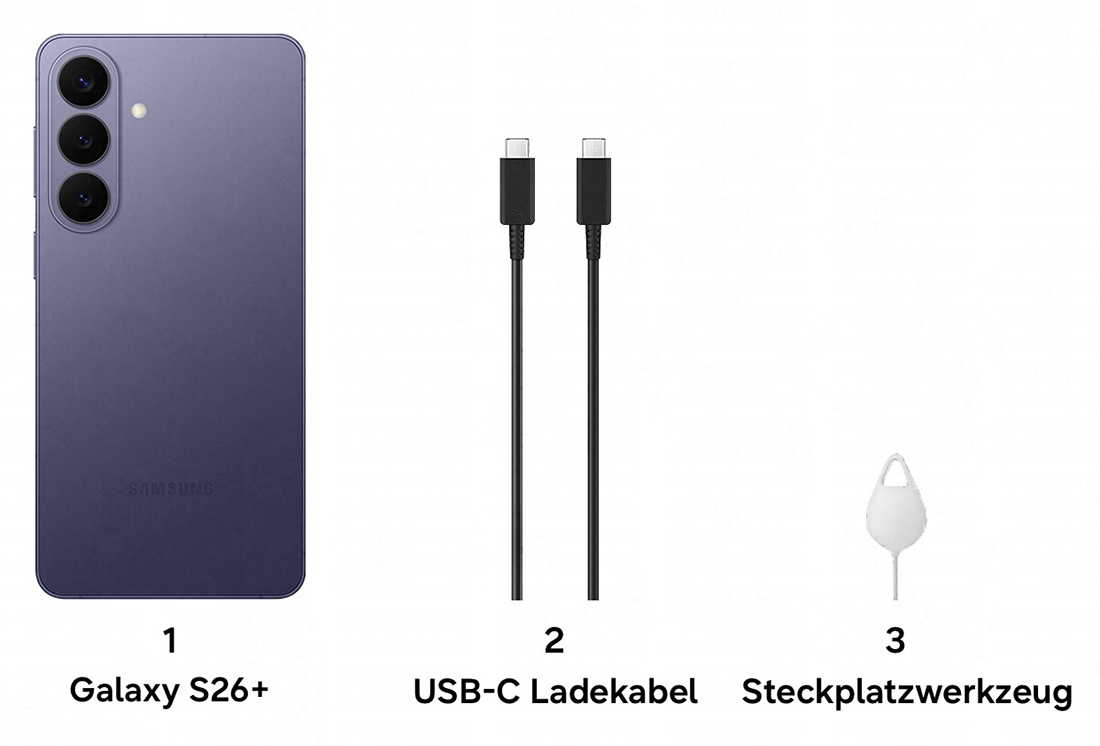 Lieferumfang: Samsung Galaxy S26+, Akku (fest verbaut), Datenkabel (USB-C auf USB-C), Steckplatzwerkzeug, Kurzanleitung
