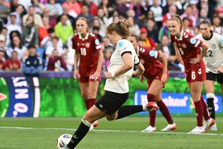 Das änderte sich in der 18. Minute. Auf Vorarbeit von Jule Brand schloss Klara Bühl überlegt ab. Der zunächst anerkannte Treffer zählte allerdings nicht, weil Nüsken im Abseits stehend die dänische Torhüterin irritierte. Der Treffer wenig später auf der Gegenseite war dagegen regulär. Dabei machte die gesamte deutsche Defensive inklusive Torhüterin Ann-Katrin Berger keine gute Figur.