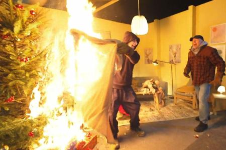 Beim zweiten Versuch steckt Stefan Raab dann einen Weihnachtsbaum in Brand. Bei den ersten kleinen Flammen würde noch Wasser reichen, erklärt der Experte, doch der Comedian möchte, dass das Feuer noch spektakulärer aussieht, bevor er einschreitet. "Ist das noch ein Entstehungsbrand?", hakt Raab beim Feuerwehrmann nach. "Das ist viel mehr. Ich bin weg", tritt dieser schon die Flucht an, als das Feuer immer weiter zunimmt. Schließlich kippt Raab einen großen Eimer Wasser drüber und der Brand ist gelöscht.