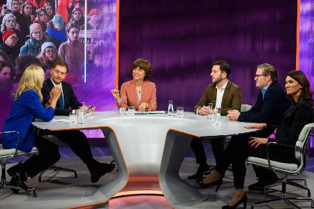© ZDF/Jule Roehr Am Donnerstag sprach Maybrit Illner (Mitte) mit (von links) Juristin Elisa Hoven, Ministerpräsident Michael Kretschmer, Grünen-Chef Felix Banaszak, Journalist Michael Bröcker und Landrätin Tanja Schweiger.