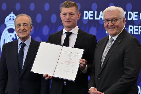 "Es war auch Ihr sympathisches und besonnenes Auftreten auf und neben dem Platz, das Sie zum Vorbild für viele junge Fußball-Talente und Sportbegeisterte gemacht hat", so der Bundespräsident. Auch der Präsident von Real Madrid, Florentino Pérez (78), hielt eine Rede für Kroos und würdigte ihn sichtlich bewegt als "einen der besten Spieler aller Zeiten".