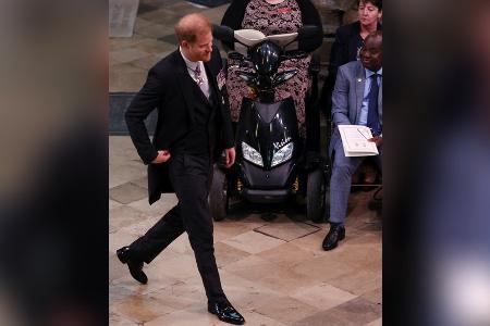 Da seine Frau Meghan (41) mit den zwei Kindern zuhause in Kalifornien geblieben ist, musste Prinz Harry (38) ohne Begleitung in der Westminster Abbey einlaufen. Er kam mit seinem Onkel Prinz Andrew (63) und seinen Cousinen Beatrice (34) und Eugenie (33). An der Tür trennten sich die royalen Gäste jedoch für ihren Gang durch die Kirche.